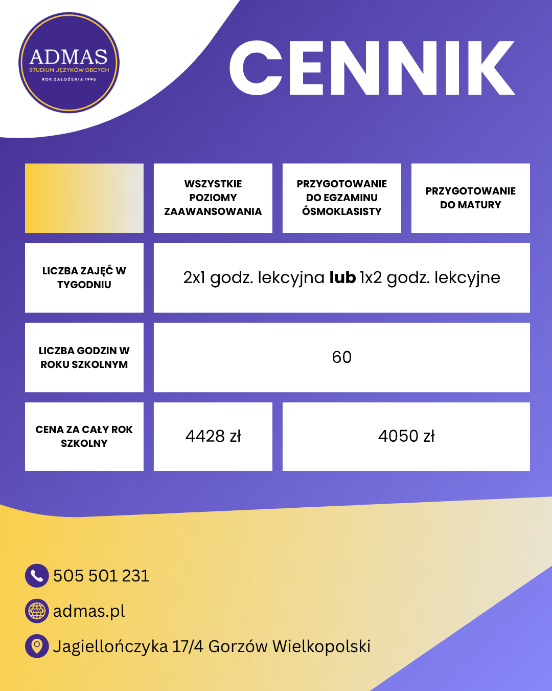 Organizujemy kursy językowe dla dzieci (od 7 roku życia), młodzieży i dorosłych. Lekcje prowadzimy dla słuchaczy indywidualnych, zorganizowanych grup, a także na zlecenie przedsiębiorstw.
